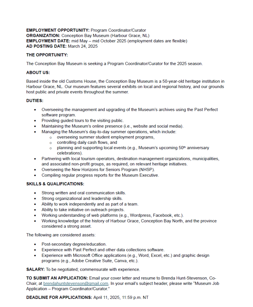 EMPLOYMENT OPPORTUNITY: Program Coordinator/Curator ORGANIZATION: Conception Bay Museum (Harbour Grace, NL) EMPLOYMENT DATE: mid May – mid October 2025 (employment dates are flexible) AD POSTING DATE: March 24, 2025