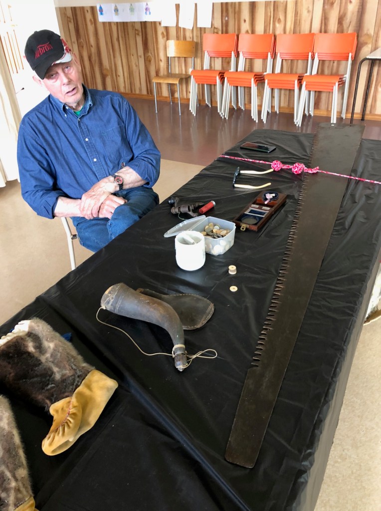 Pat displayed Bishop John March’s skis, which he purchased from the recently deceased “Singin’ Cobbler” of Harbour Grace, Bill Luffman, and the scythe used by his grandfather, John Collins, to cut tall fields of grass in Riverhead, when farms were common there.
