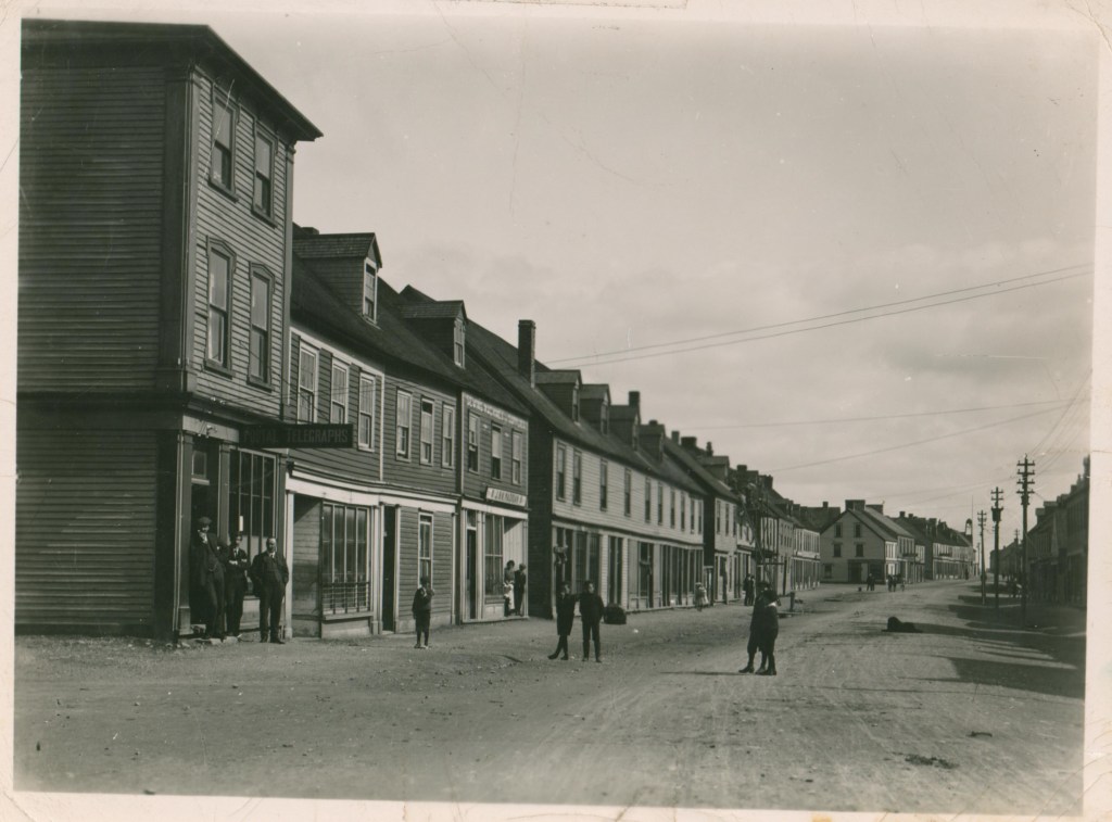 This is a photo of Water Street, Harbour Grace, looking east, circa 1910. In the photo, “Postal Telegraphs” is advertised in building furthest to the left, and further up the road is a building advertising “Sewing Machines & Supplies.”