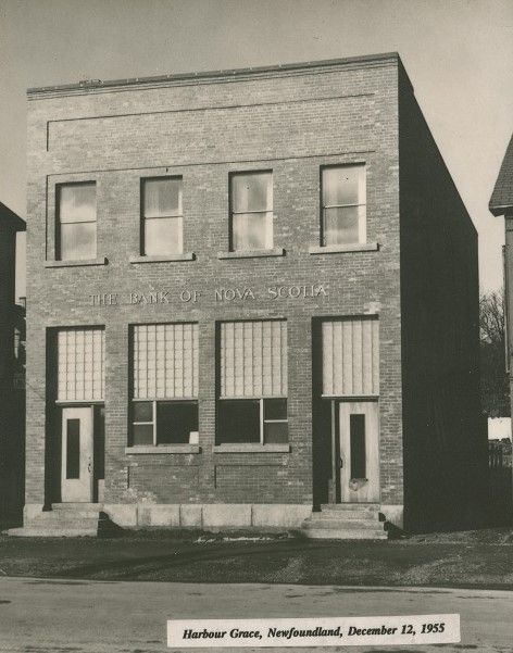This is a photograph of the old post office on Water Street, Harbour Grace. This building was destroyed by the Great Fire in 1944. This photo was taken at the bottom of Bannerman street, looking south
